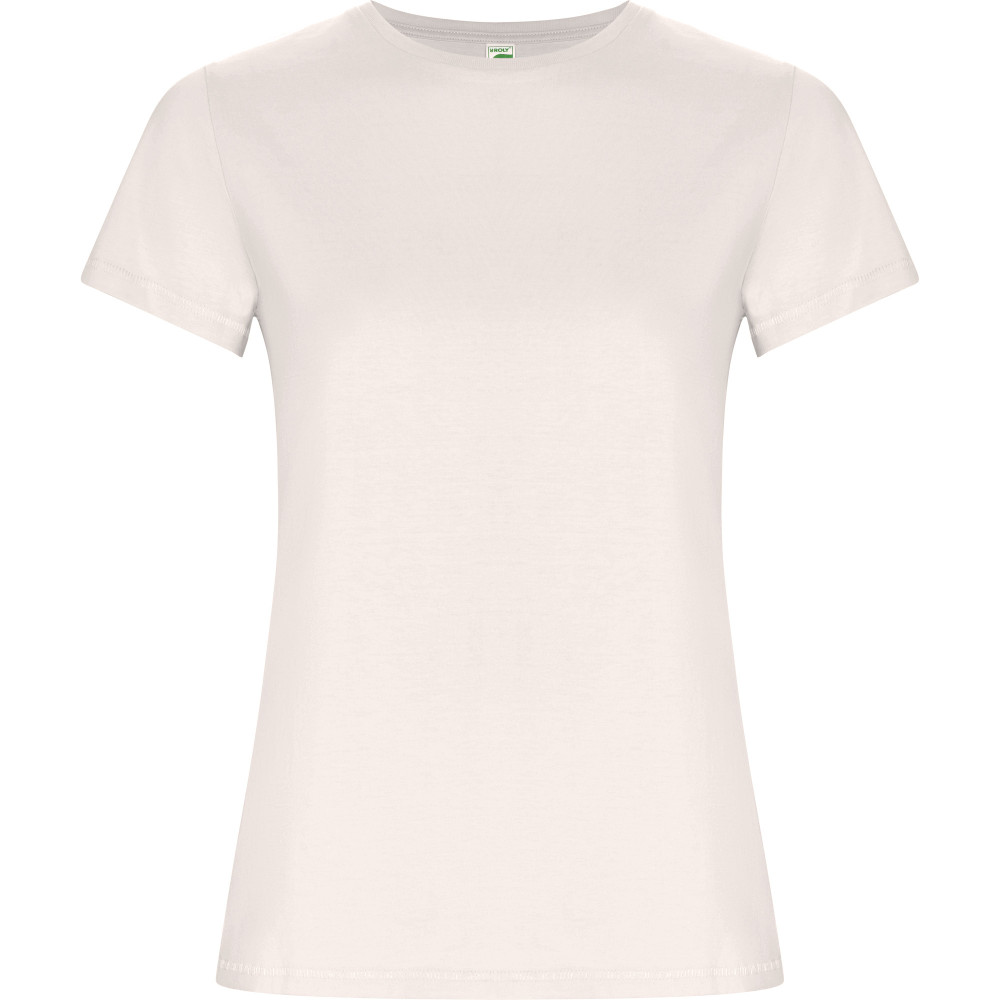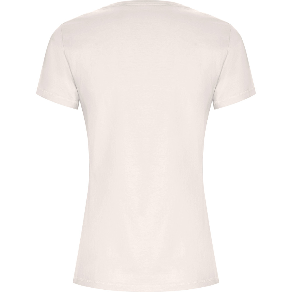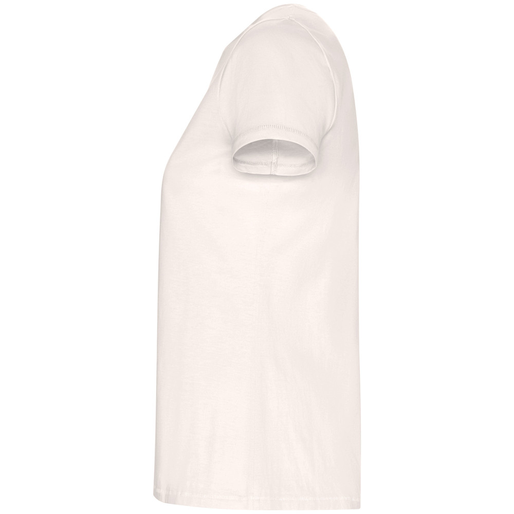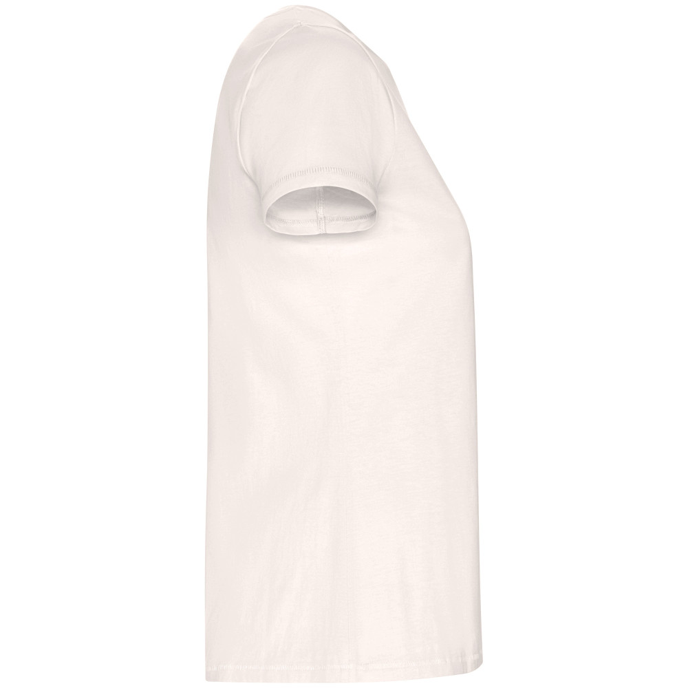 Dámské tričko s krátkým rukávem z organické bavlny, vypasovaný střih. Kulatý průkrčník s žebrováním 1x1. Dekorativní prošití na spodním lemu a rukávech. Boční švy.