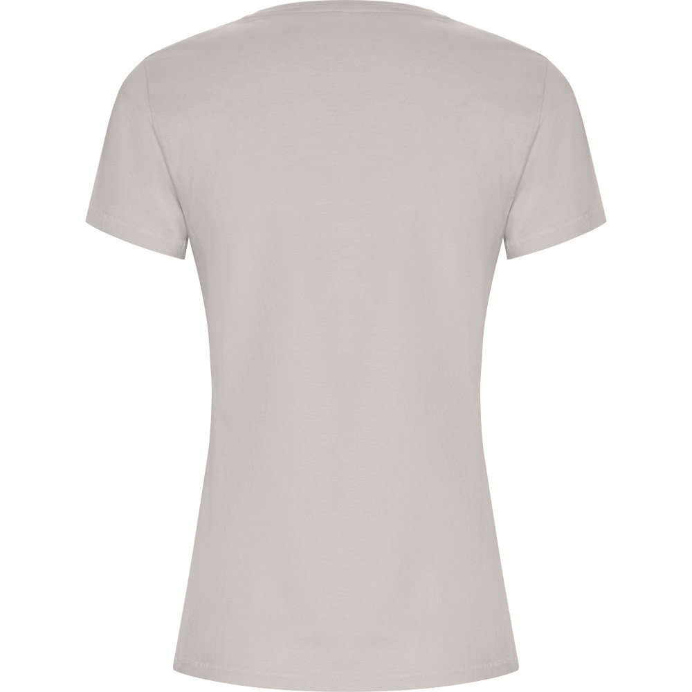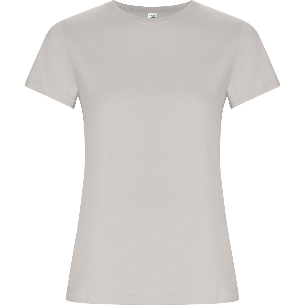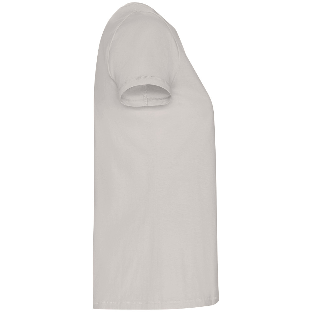 Dámské tričko s krátkým rukávem z organické bavlny, vypasovaný střih. Kulatý průkrčník s žebrováním 1x1. Dekorativní prošití na spodním lemu a rukávech. Boční švy.