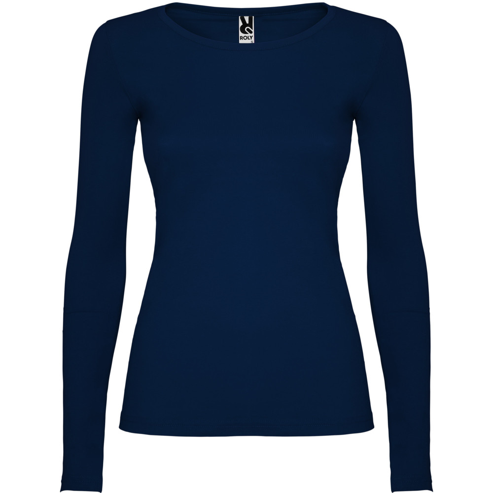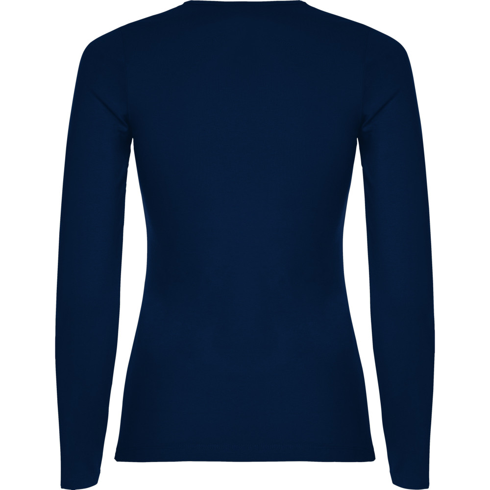 Polopřiléhavé dámské triko s dlouhým rukávem a kulatým výstřihem zakončeným jemným lemem. Rukávy bez manžet, boční švy.