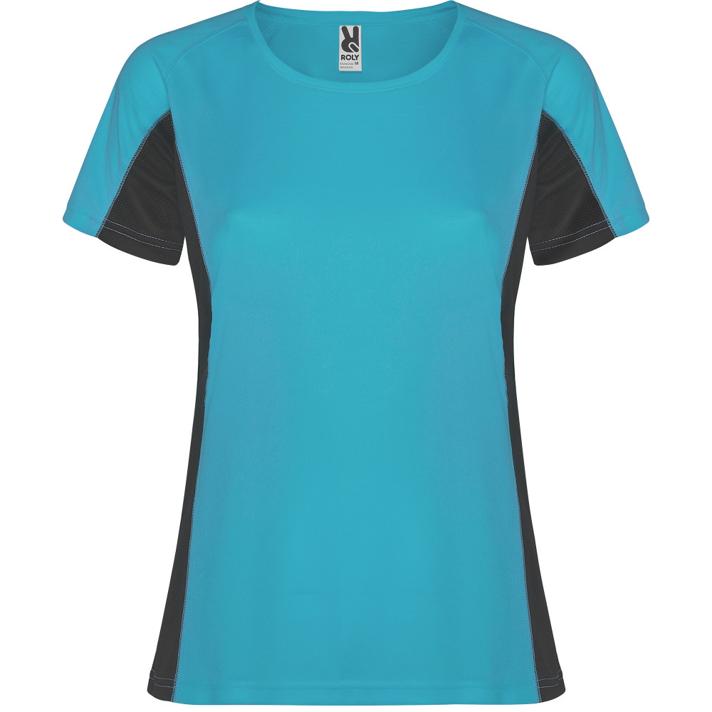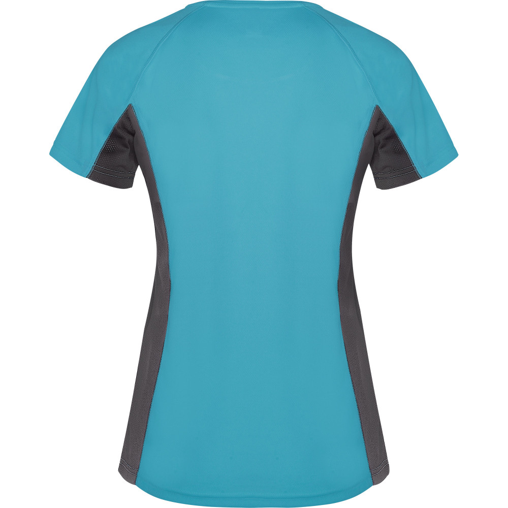 Dámské funkční triko s krátkým rukávem. Kombinace dvou polyesterových tkanin. Hlavní materiál: 100% polyester-honeycomb, boční panely: 100% mikroperforovaný polyester. Raglánové rukávy. Kulatý výstřih, zpevněné švy na průkrčníku. Pohodlné a snadno přizpůsobivé.