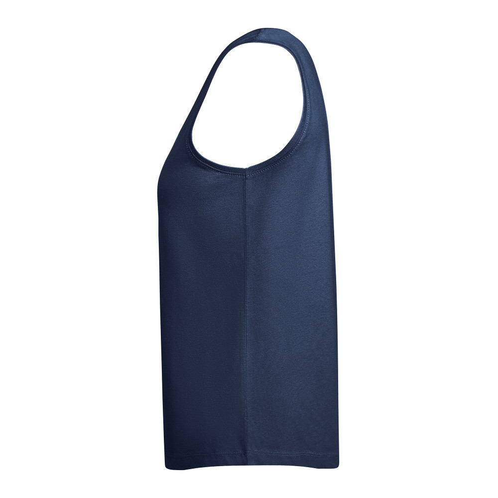 Volné dámské tílko se širokými ramínky. 1x1 žebrovaný výstřih a průramky. Oblý tvar spodního lemu. Boční švy.