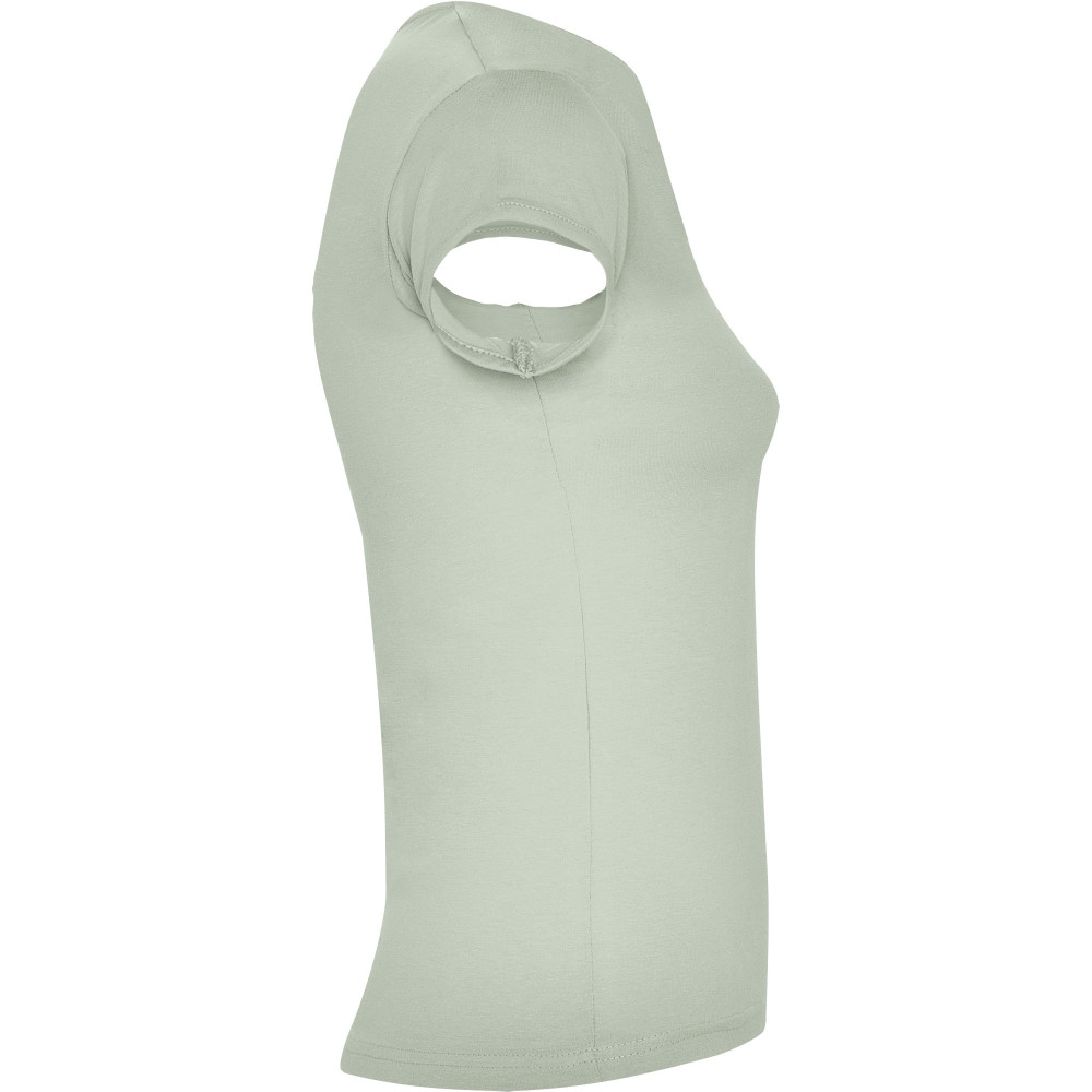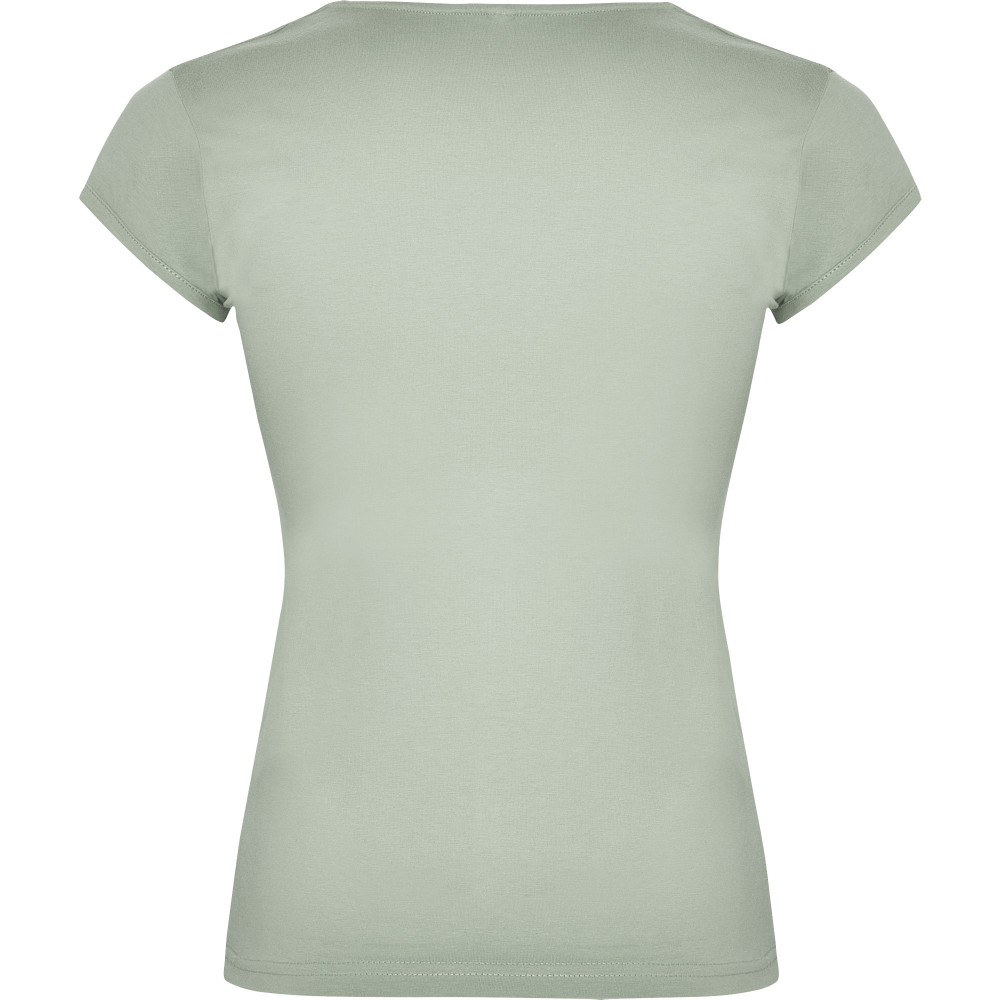 Vypasované dámské tričko s kulatým výstřihem prostřiženým do V. Krátké rukávky, boční švy.