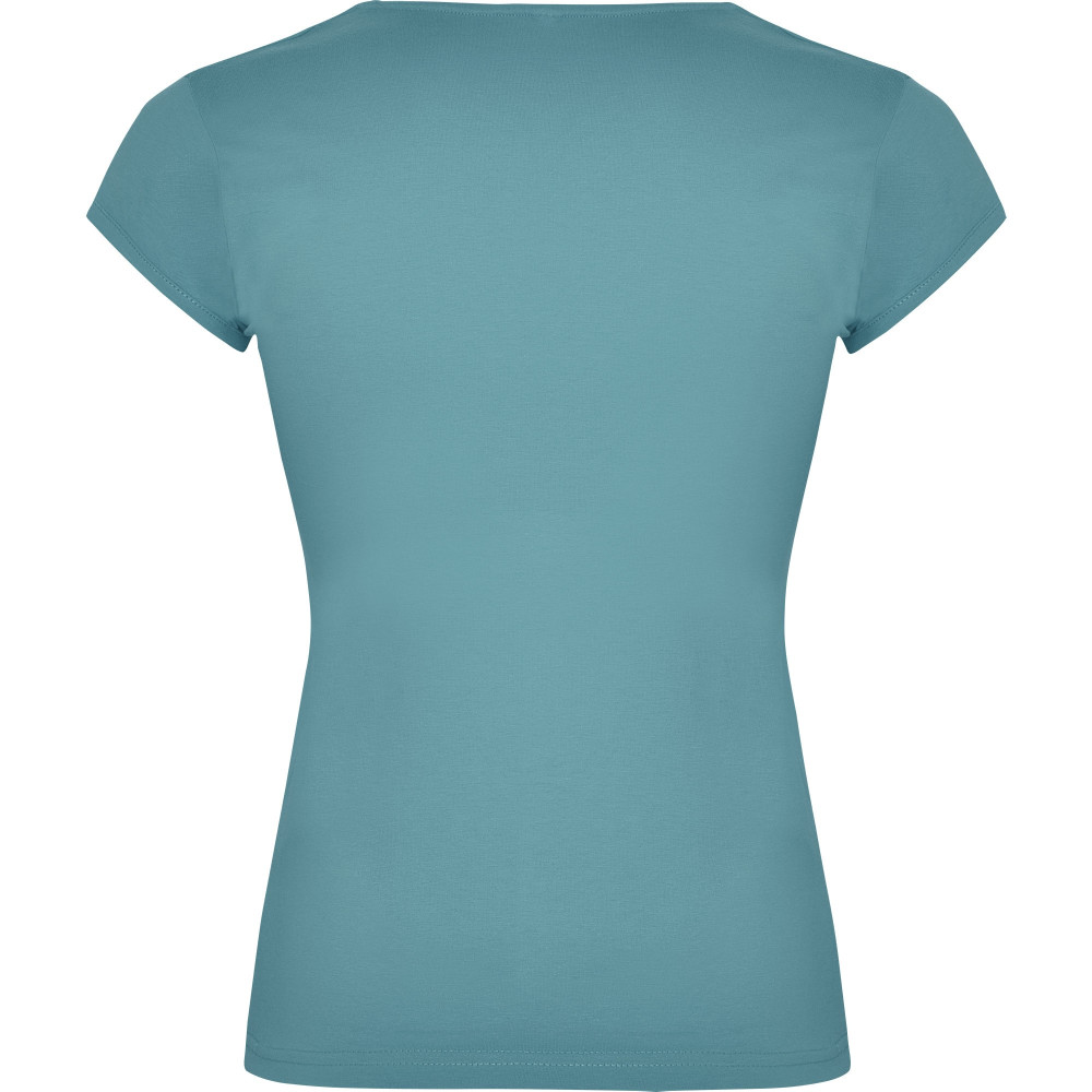 Vypasované dámské tričko s kulatým výstřihem prostřiženým do V. Krátké rukávky, boční švy.