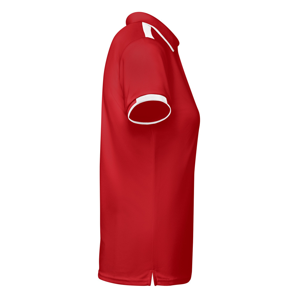 Dámská sportovní polokošile s krátkým rukávem z antibakteriálního recyklovaného polyesteru. Polokošile má 1x1 žebrovaný límec a detail v kontrastní barvě v lemech rukávů a na ramenou. Zesílené kryté švy v límci. Zapínání na dva zapínací knoflíky a skrytý spodní knoflík. Boční rozparky na spodním lemu.