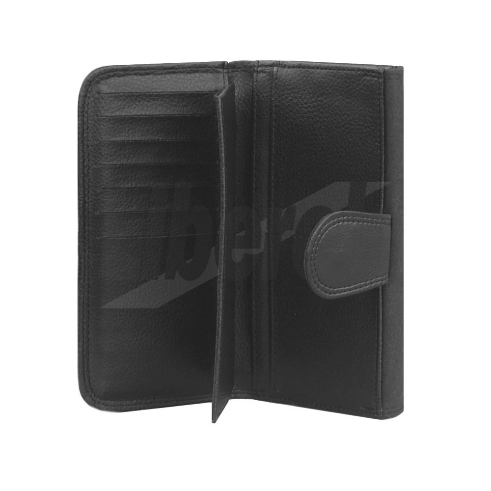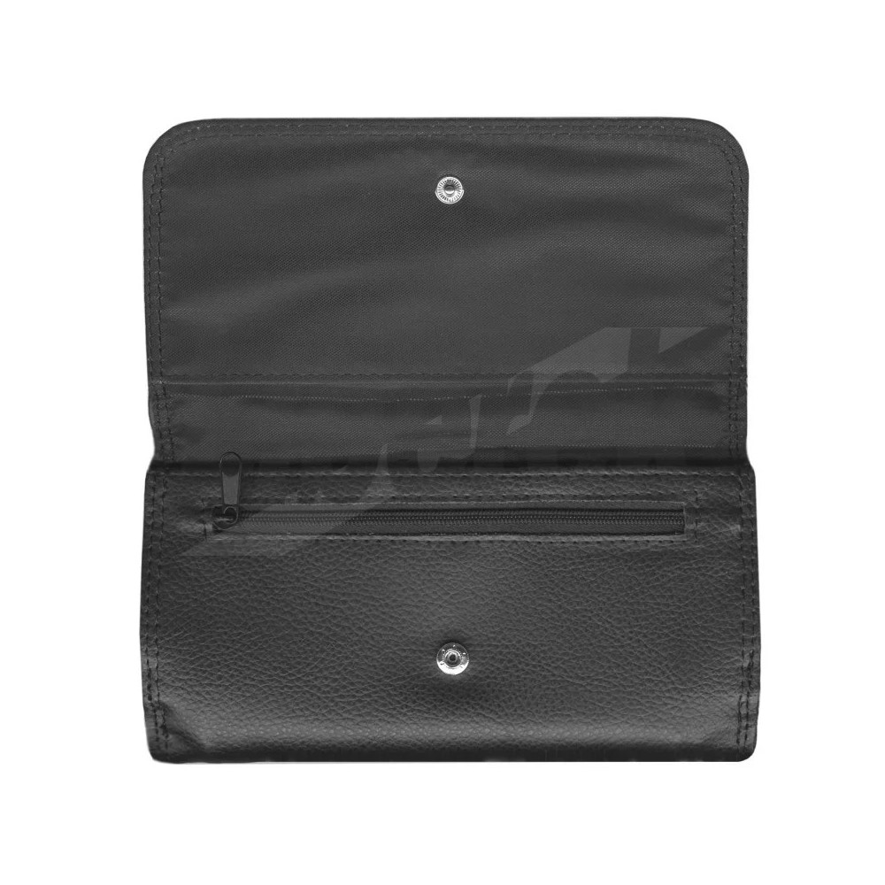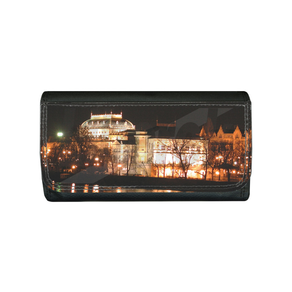 Peněženka z umělé kůže s čelní bílou plochou (PE) na potisk. Peněženka má přední část s uzávěrem na patent pro bankovky a zip na mice. Zadní část na patent má více přihrádek na bankovky, karty, viz. obr.