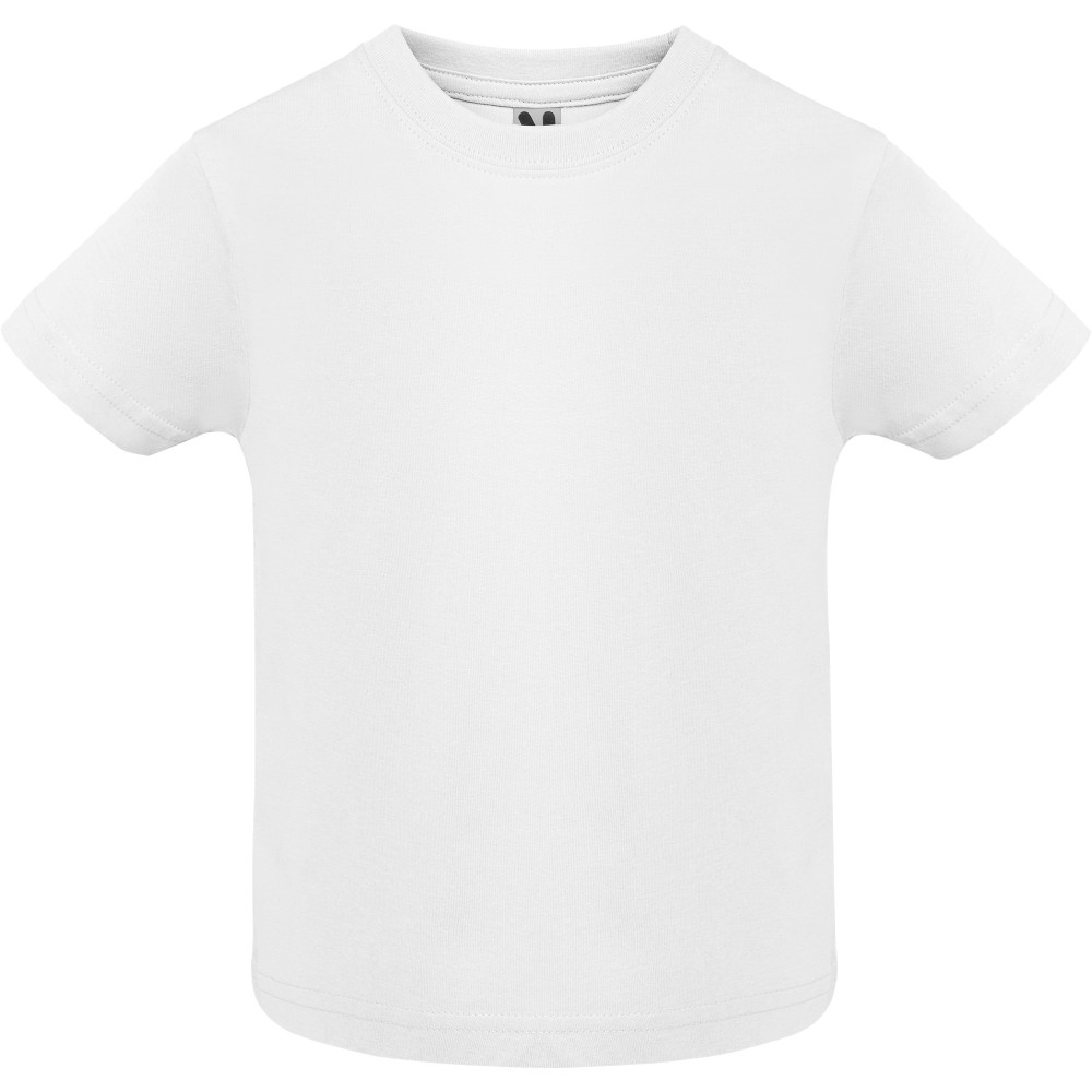 Bavlněné dětské tričko s kulatým průkrčníkem a bočními švy. Velikosti 6, 12 a 18 měsíců se zapínáním na rameni.