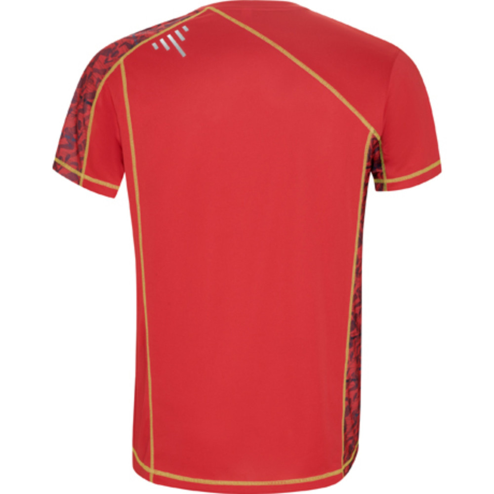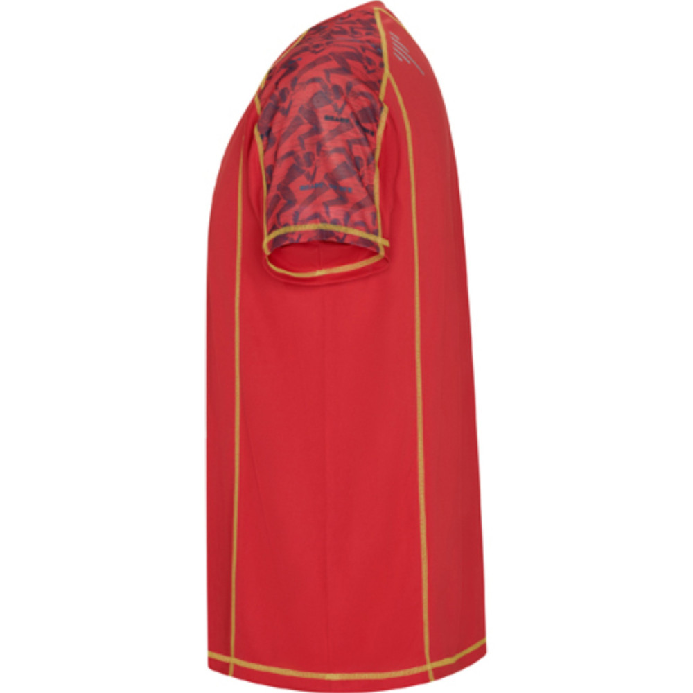 Sportovní tričko s raglánovými rukávy a potisknutými panely na levé straně ramene a pravém boku. Vyrobeno z materiálu s příměsí recyklovaného polyesteru. Prošití švů ve fluor barvě. Štítek s logem ECO na rukávu. Zabaleno samostatně v recyklovatelném sáčku.
