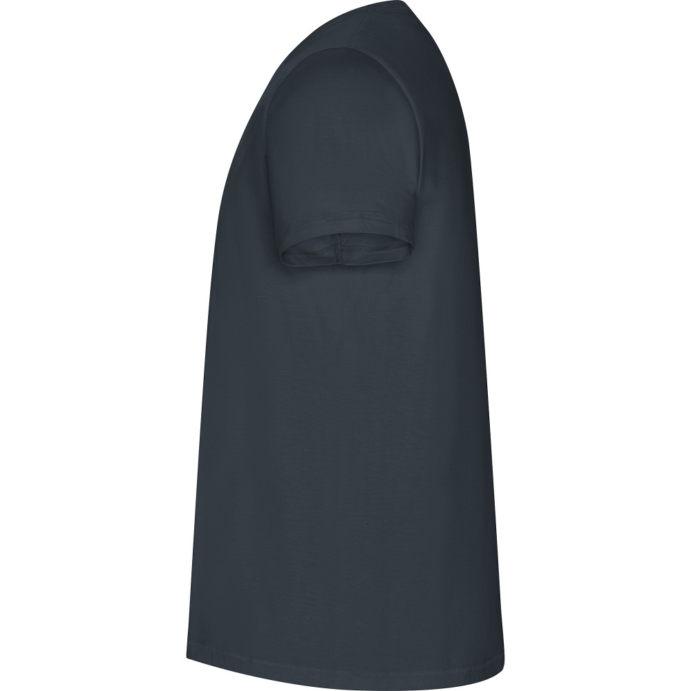 Pánské tričko s krátkým rukávem z organické bavlny, bez bočních švů. Kulatý průkrčník s žebrováním 1x1. Dekorativní prošití na spodním lemu a rukávech. Barva 58 (melange) - složení 85% bavlna/15% polyester
