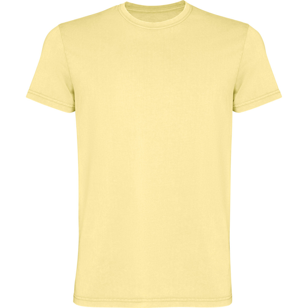 Pánské tričko s krátkým rukávem. Česaná bavlna s vypraným efektem. Kulatý výstřih s žebrováním 1x1. Podlepený výstřih ze stejného materiálu. Dvojité švy na bocích a v podpaží.