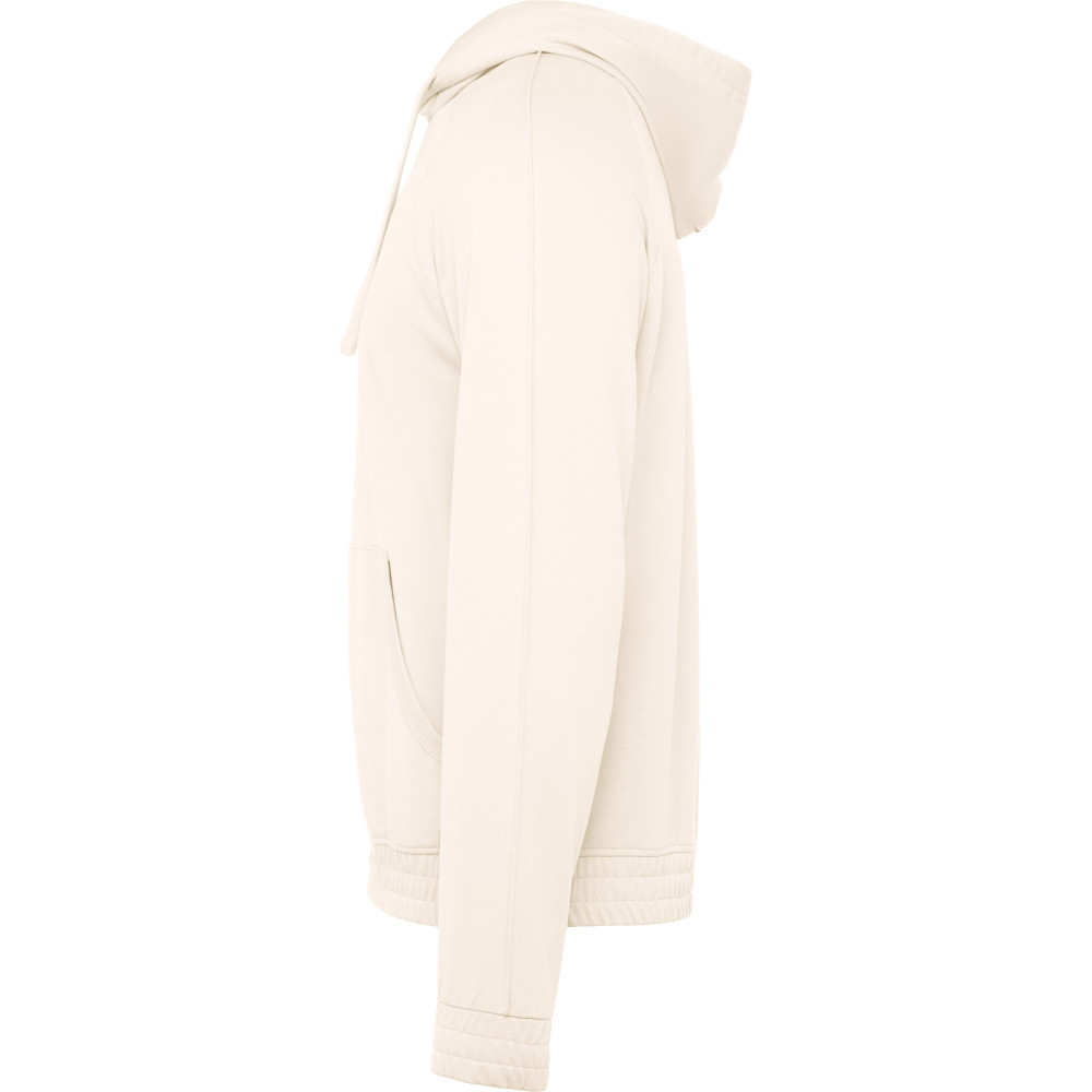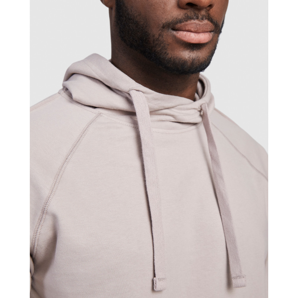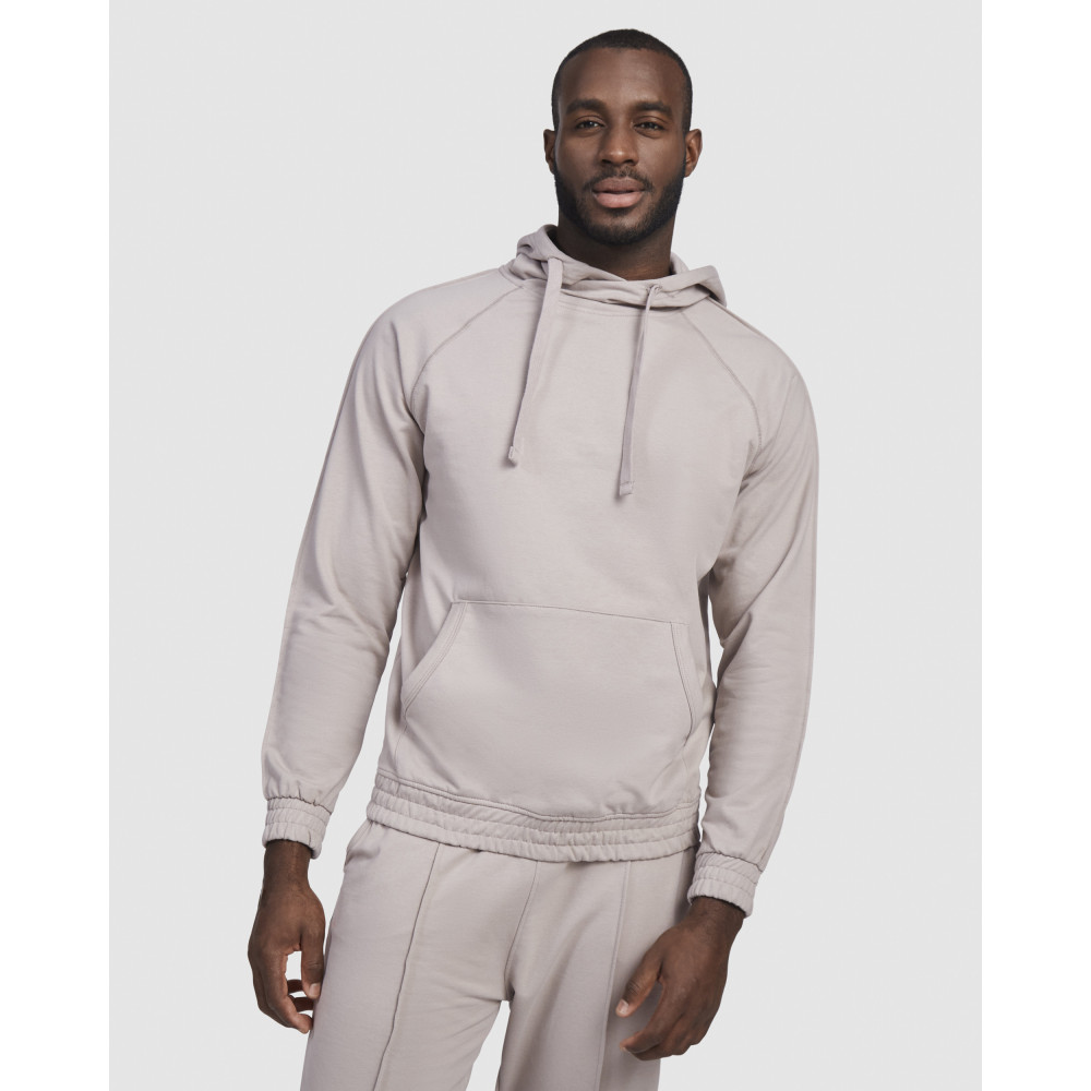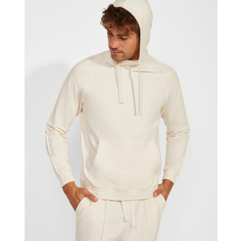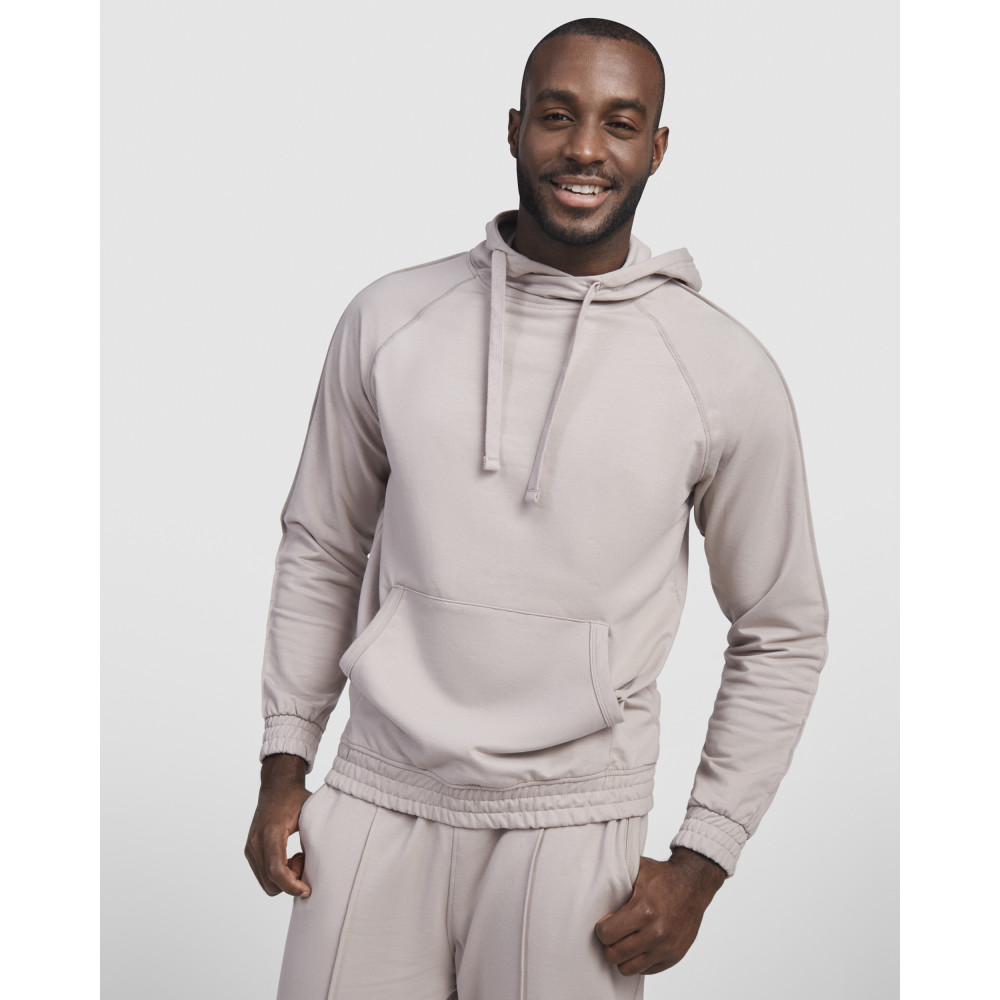 Pánská mikina s kapucí a klokaní kapsou. Plochá stahovací šňůrka s vyšívanými otvory. Manžety a spodní lem ze stejné látky mikiny. Prošívané detaily na rukávech.