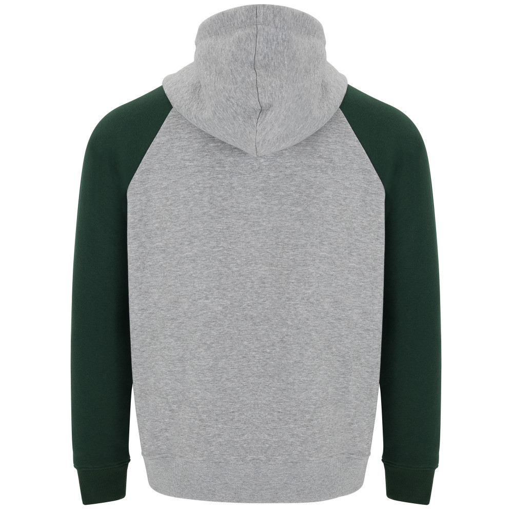 Pánská / dětská dvojbarevná mikina. Mikina má překřížený výstřih a kovové kroužky na šňůrky, kontrastní vnitřní kapuci a šňůrky, kontrastní rukáv raglánového stylu a klokaní kapsu. Manžety a spodní lem jsou s elastickým žebrováním 1x1. Odnímatelný štítek.