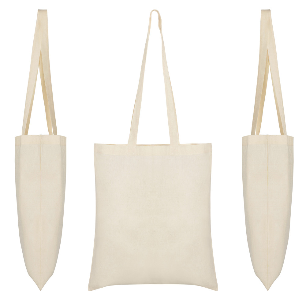 Nákupní taška vyrobená z bavlněné tkaniny v přírodní barvě.