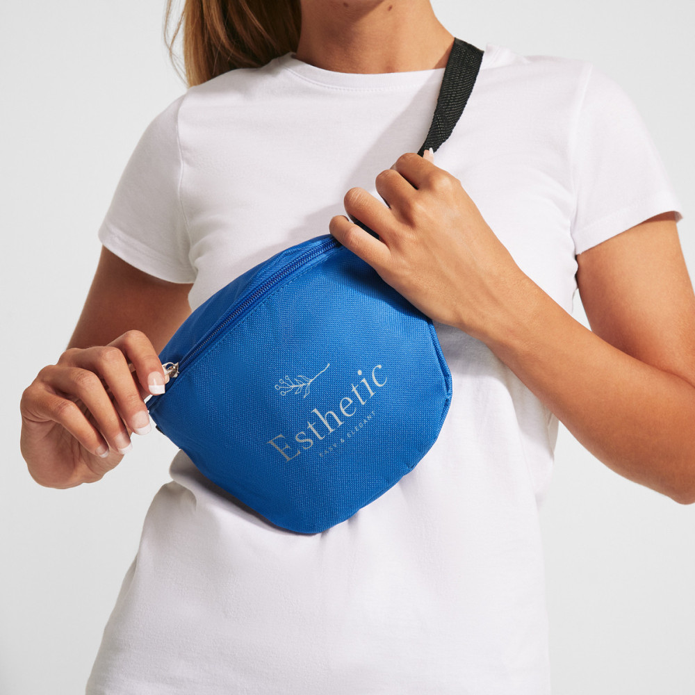 Pouzdro na opasek z polyesteru 600D se dvěma přihrádkami, na přední a zadní straně. Odpovídající zipy a taháčky. Nastavitelný popruh.