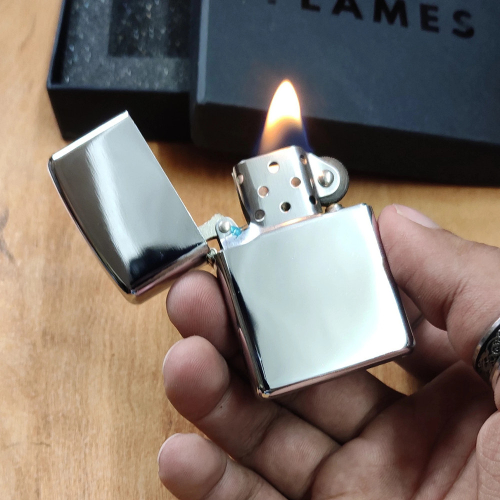 Plnitelný kovový benzinový zapalovač s lesklým povrchem. Dodáváno nenaplněné.